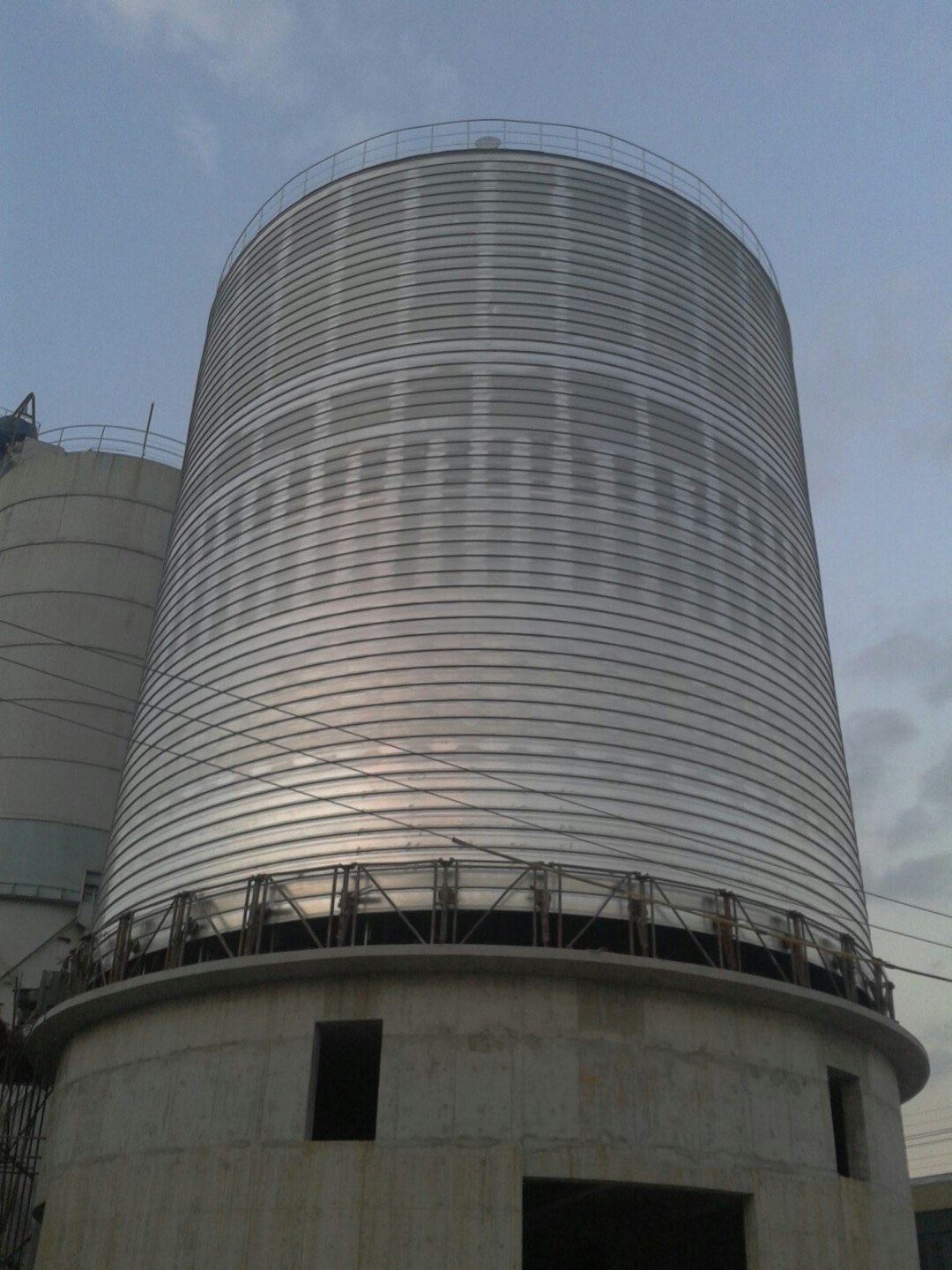 钢板仓在建造过程中,完全由专用设备施工,在卷制过程中,仓体外壁咬制成一条五倍于材料厚度 30mm-40mm宽的螺旋凸条,大大加强了仓体的承载能力,使钢板仓的整体强度、稳定性、抗震性优于其它池罐。另外,它采用的是防腐性能特别强的材料,这使得它的寿命也比其它池罐长。